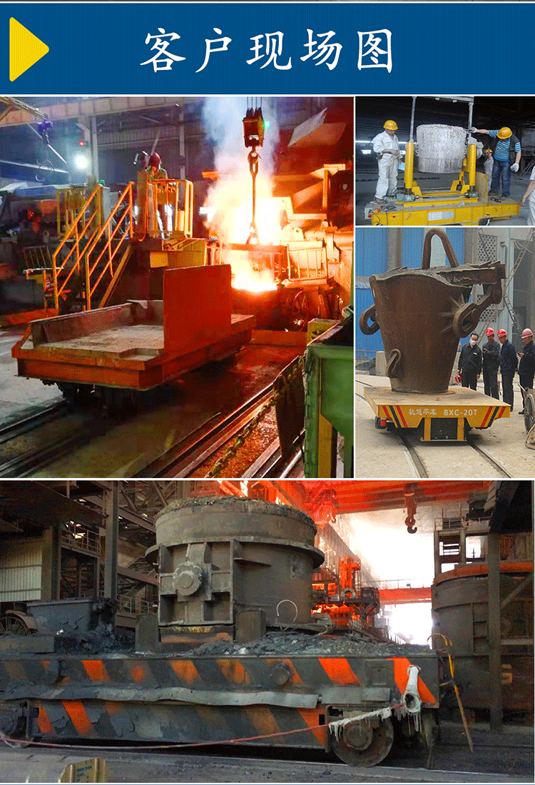 鋼包車是一種專為各大鋼廠、銅廠及冶煉廠、鑄造廠設計制造的一種運輸高溫包體軌道式運輸工具,在客戶不同的需求下可以按照包體的大小尺寸、重量和環境溫度、包體外部溫度等條件量身定制,也可以按照不同需求及客戶方提供的圖紙制作。當然,環境不同鋼包軌道車的制作方式也不同,通常環境溫度在100度以上的可選用電纜卷筒或拖電纜供電,這兩種供電方式的鋼包軌道平車可耐100-1000度的高溫,電纜線選用強度的耐高溫電纜,其電機、減速機及電控箱都采取隔熱防護措施,以避免在高溫環境下受損,影響臺車的正常使用。