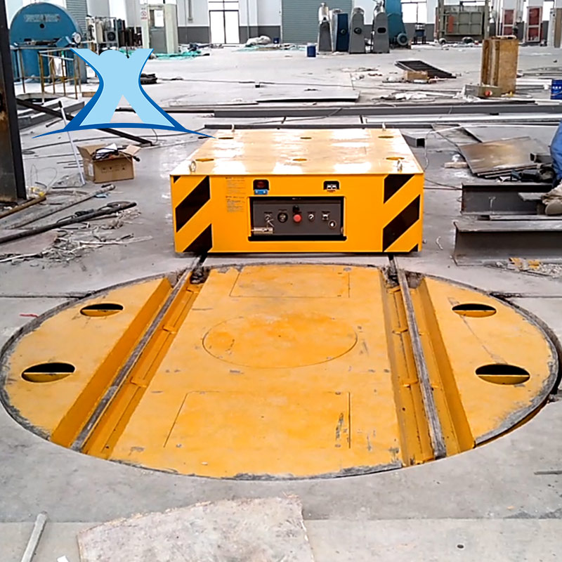 實現軌道平車原地轉彎換向的設備,安裝在兩條軌道交叉的位置,其臺面上鋪設一條或多條軌道,軌道上表面與地面上的軌道上表面平齊,軌距與地面的軌距一致,平車完全運行至轉盤上停止,轉盤啟動轉動至需要的角度與地面的軌道完成對接,平車再次啟動沿對接后的軌道運行至需要的位置。其特殊的功能是軌道運輸系統中常見的設備。臺車自重加載重就是配套轉盤的載重量,轉盤的旋轉角度可根據客戶的不同需求設定,可實現360度任何一個角度停止,也可實現井型十字交叉運行。